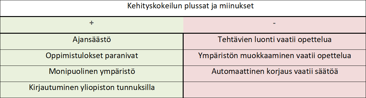 Opettajan näkökulmasta kokeilusta saatu suurin hyöty oli huomattava ajansäästö tehtävien tarkastuksessa. Vapautunutta aikaresurssia pystyttiin käyttämään muun muassa tutortupasessioiden pitämiseen, jolloin apua kaipaavat opiskelijat saivat yksilöllisempää ohjausta ongelmien ratkaisuun ja vaikeiden oppiainesten läpikäyntiin. Taulukossa 2 on koottu opettajan näkökulmasta kehityskokeilun hyötyjä ja haasteita.