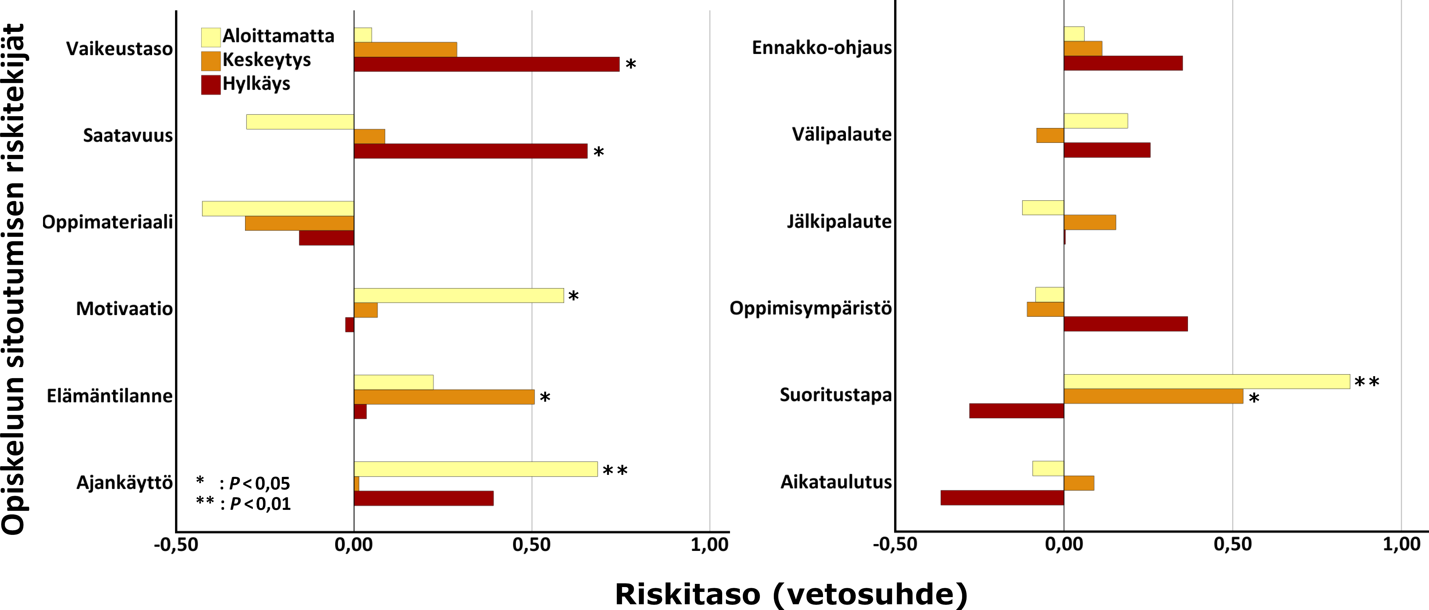 Mallinsimme opintoihin sitoutumisen riskitekijöitä logistisella regressiolla suorittamisen eri tasoilla (opintojakso hylätty, kesken ja aloittamatta). Kunkin tekijän riskitaso opiskelumenestykselle (selitysaste/vetosuhde) näkyy kuviossa 1. Hylkäystä ennustivat tehtävän vaikeustaso ja oppimateriaalin huono saatavuus. Tehtävän laatimisen keskeyttämiseen olivat yhteydessä elämäntilanne ja suoritustapa. Aloittamatta jättämiseen olivat yhteydessä ajankäyttö, motivaatio ja suoritustapa. Hyväksyttyä suoritusta tukivat erityisesti motivaatio ja marginaalisesti suoritustapa.