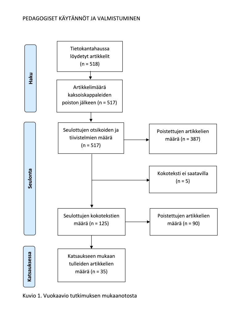 Vuokaaviossa (kuvio 1) kuvataan tutkimuksen sisällyttäminen katsaukseen. Haku tuotti 518 artikkelia, joista kaksoiskappaleiden jälkeen arvioitaviksi jäi 517 artikkelia. Nämä artikkelit seulottiin otsikon ja tiivistelmän perusteella, ja kokotekstitarkasteluun valittiin artikkelit, jotka täyttivät taulukon 2 kriteerit. Tarkastelu pysäytettiin siinä vaiheessa, kun ensimmäinen poissulkukriteeri täyttyi. Viittä artikkelia ei saatu käyttöön, vaikka niitä pyydettiin suoraan kirjoittajilta. Kokotekstiseulontaan päätyi 125 artikkelia, ja tässä vaiheessa käytettiin samoja kriteereitä kuin edellä. Poissulun tyypillisimpiin syihin kuului seuraavien tekijöiden merkityksen tarkastelu suhteessa valmistumista koskeviin tulosmuuttujiin: erityisryhmään kuuluminen, korkeakouluopintoja edeltävät tekijät, sisäänottoon liittyvät tekijät, opiskelijan sisäiset muuttujat, asumisjärjestelyt ja vapaa-ajan aktiviteettien merkitys sekä talouteen liittyvät tekijät. Lopulliseen katsaukseen valikoitui 35 artikkelia (taulukko 3). Yksi arvioija suoritti seulonnan kahteen kertaan.