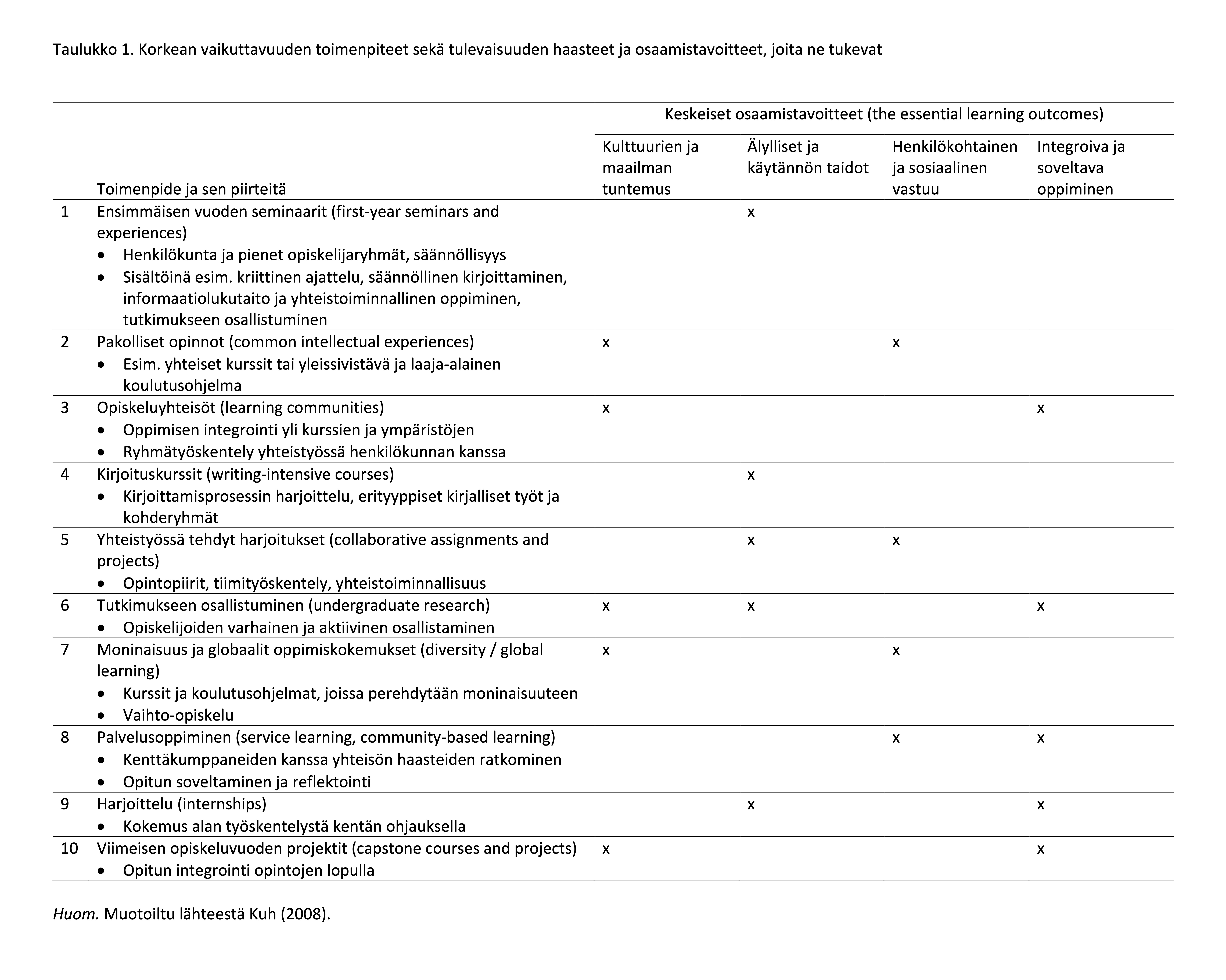 The Association of American Colleges and Universities, AAC&U, määritteli vuonna 2008 kymmenen tutkimusnäyttöön perustuvaa ja erilaisista taustoista tuleville opiskelijoille hyödyllistä korkean vaikuttavuuden toimenpidettä (Kuh, 2008). Nämä esitellään taulukossa 1, jossa kuvataan lyhyesti toimenpiteiden sisältö sekä mihin tulevaisuuden haasteisiin ja osaamistavoitteisiin ne liittyvät. Osa näistä toimenpiteistä kohdistuu tyypillisesti opintojen alkuvaiheeseen: ensimmäisen vuoden seminaarit, pakolliset opinnot, opiskeluyhteisöt ja kirjoituskurssit. Kuh (2008) kuvaa näiden toimenpiteiden olevan opiskelijoita aktivoivia keinoja, joilla voidaan tukea opiskelijoiden oppimista, kiinnittymistä ja sitoutumista opintoihin ja valmistaa heitä tulevaan työuraan. Suuri osa toimenpiteistä keskittyy itseopiskelun ohella ryhmässä opiskeluun ja harjoituksiin.