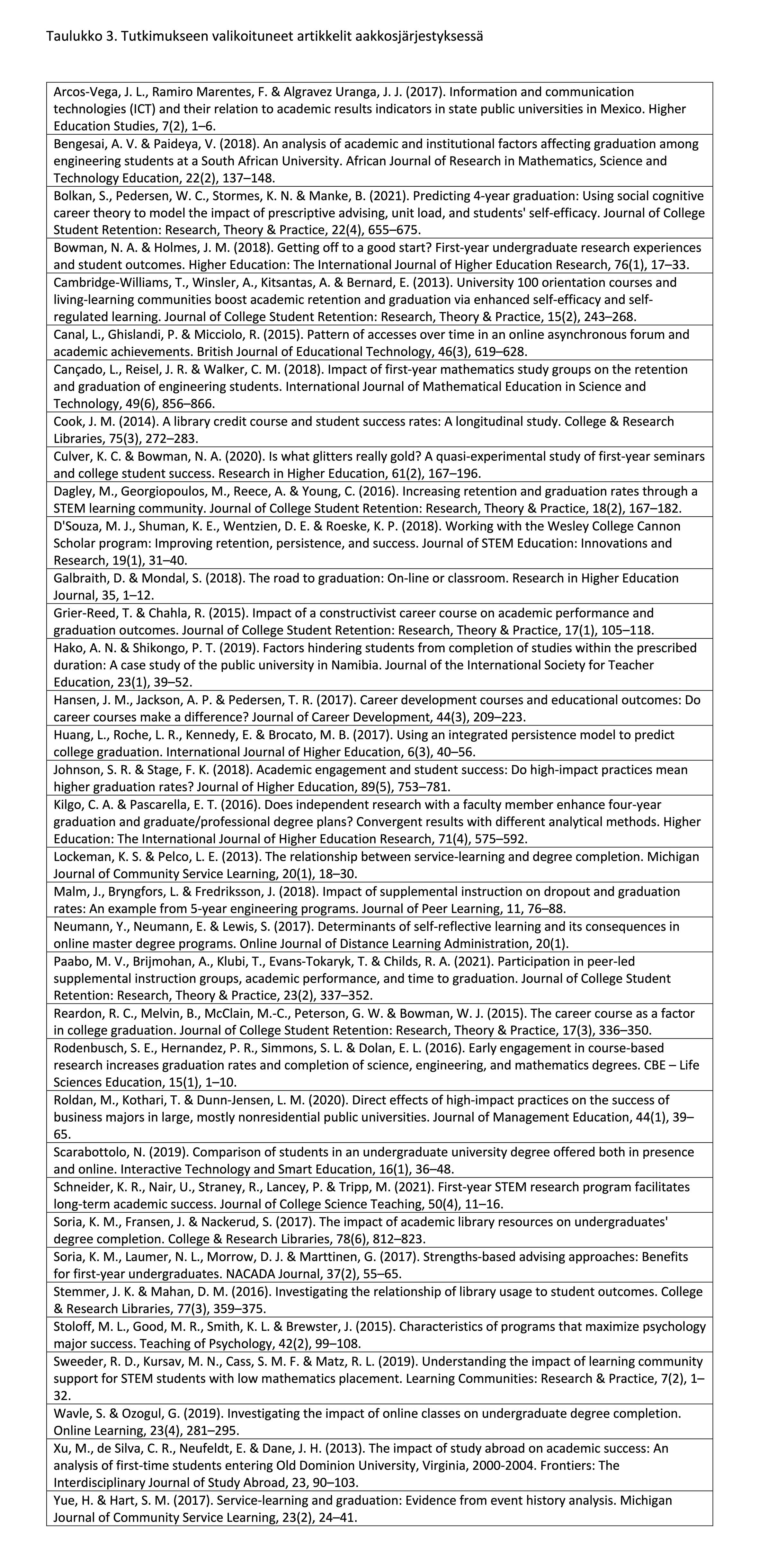 Tämän tutkimuksen tavoitteena oli koota yhteen niitä pedagogisia käytäntöjä, jotka ovat yhteydessä perusopiskelijoiden valmistumiseen ja valmistumisaikatauluun. Työ toteutettiin systemaattisena kirjallisuuskatsauksena, joka rajautui viimeisten kymmenen vuoden aikana tieteellisissä aikakauslehdissä julkaistuihin englanninkielisiin vertaisarvioituihin korkeakoulutusta koskeviin tutkimusraportteihin. Lopulliseen tulosanalyysiin valikoitui 35 julkaisua.