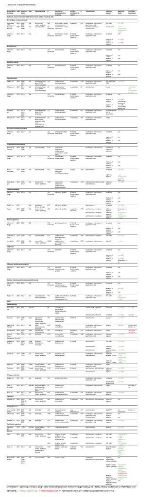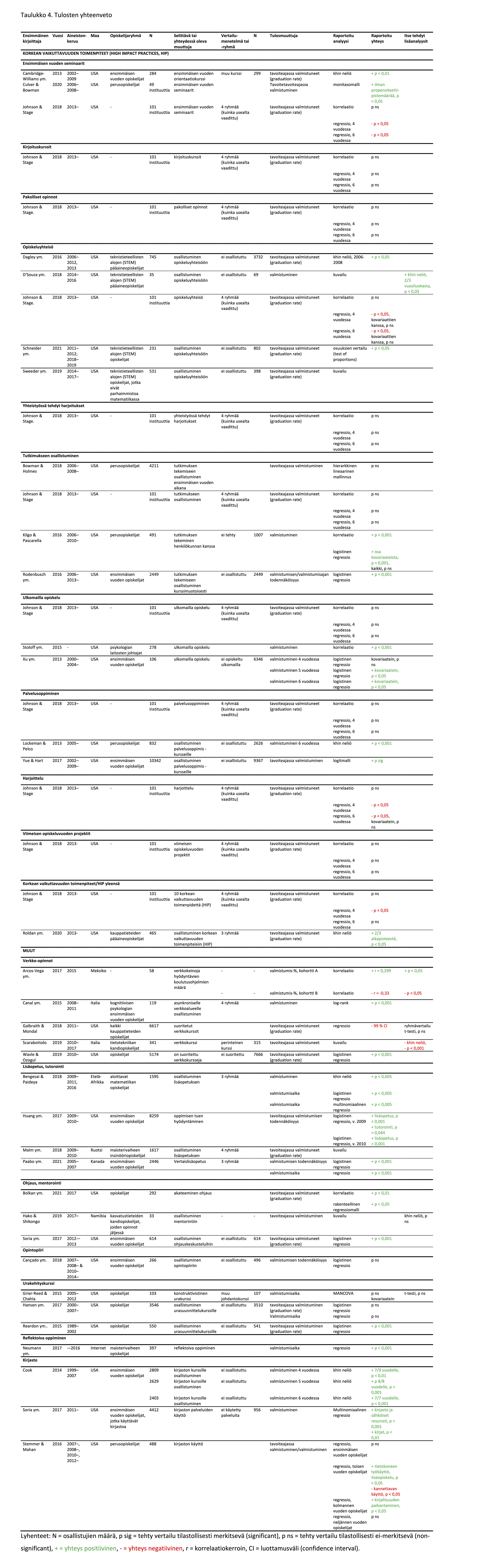 Työskentelytaulukosta jäsennetty tulosaineisto esitetään taulukossa 4, jossa alkuperäisartikkelit esitetään kunkin pedagogisen käytännön alla. Artikkelien ryhmittely tulososiossa noudattaa johdannon jaottelua, joka perustuu tutkimukseen valikoituneiden artikkelien pedagogisiin käytäntöihin. Näitä olivat korkean vaikuttavuuden toimenpiteistä ensimmäisen vuoden seminaarit, kirjoituskurssit, pakolliset opinnot, opiskeluyhteisö, yhteistyössä tehdyt harjoitukset, tutkimukseen osallistuminen, ulkomailla opiskelu, palvelusoppiminen, harjoittelu ja viimeisen opiskeluvuoden projektit. Muista pedagogisista käytänteistä esittelemme tutkimusta, joka liittyy verkko-opintoihin, lisäopetukseen ja tutorointiin, ohjaukseen ja mentorointiin, opintopiireihin, urakehityskursseihin, reflektoivaan oppimiseen ja kirjastoihin. Alkuperäisartikkelin päätelmä määrällisestä tuloksesta esitetään taulukon 4 sarakkeessa ”raportoitu yhteys” ja artikkelin kirjoittajan tekemät lisäanalyysit sarakkeessa ”itse tehdyt analyysit”. Seuraavassa vedetään yhteen taulukoituja tuloksia kustakin pedagogisesta käytännöstä sen mukaan, miten alkuperäisartikkeleissa nousi esiin positiivista, negatiivista tai neutraalia näyttöä.
