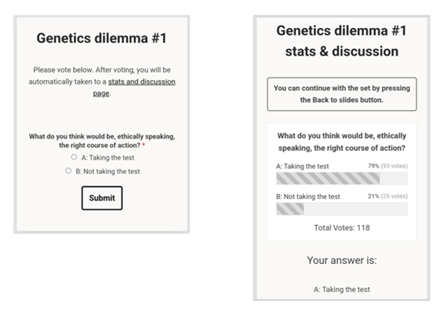 Bioetiikan perusteet -kurssilla opiskelijoita pyydettiin suorittamaan tavanomaisesti yksi sovelluksen oppitunneista ennen seuraavaa luentoa. Yksi kurssilla käytetyistä sovelluksen oppitunneista käsitteli geenitiedon hyödyntämiseen ja geenitutkimukseen liittyviä yhteiskunnallisia, sosiaalisia ja eettisiä teemoja. Oppitunti esitteli opiskelijoille geenitiedon ja tutkimuksen mahdollisuuksia perinnöllisten sairauksien tunnistamisessa sekä yksilöllisen hoidon kehittämisessä ja nosti esiin eettisiä ongelmia, joita perinnöllisten sairauksien tunnistamiseen ja hoitoon liittyy. Oppitunnin aikana esitellyissä dilemmoissa opiskelijat joutuivat ottamaan sekä ammattilaisen että potilaan asemassa kantaa geenitestien tekemiseen erilaisissa tilanteissa, joihin liittyy epäilyä perinnöllisestä sairaudesta (ks. kuva).