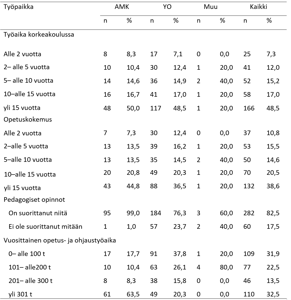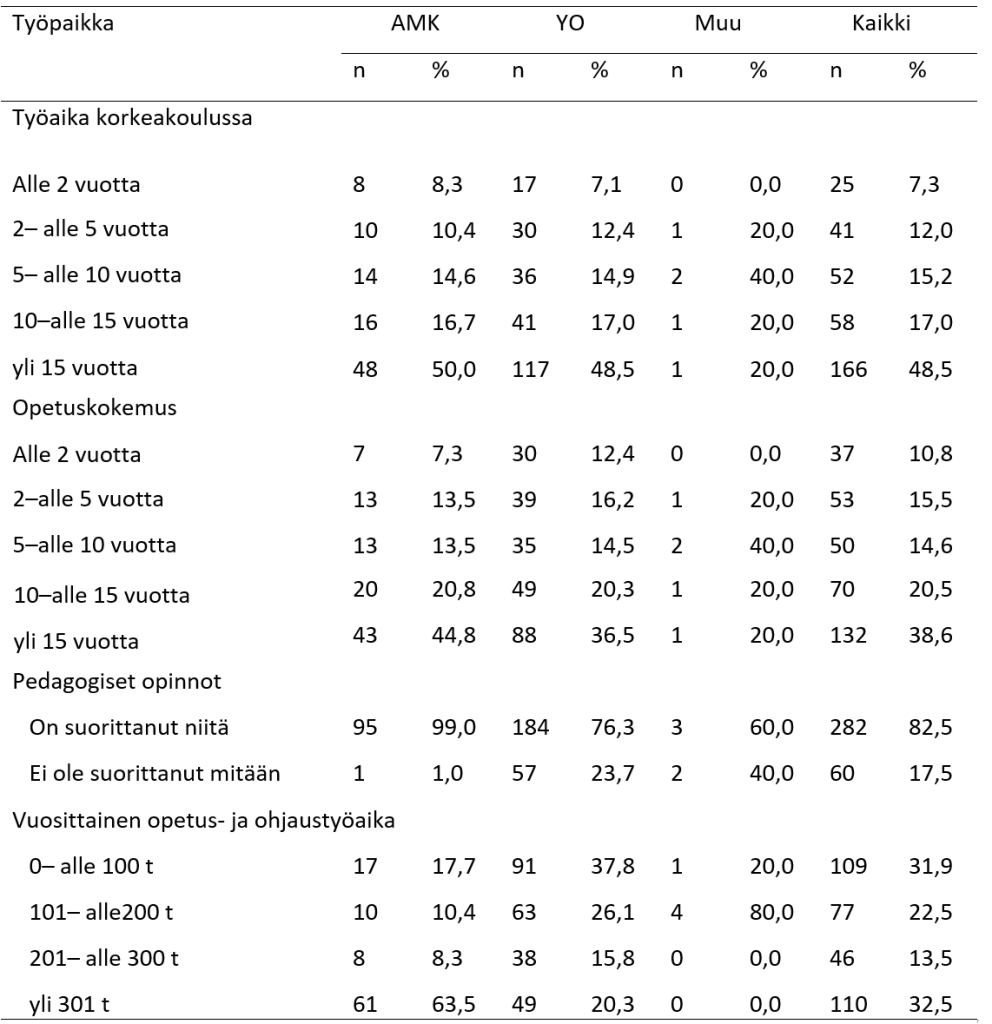 Taulukossa 1 esitellään vastaukset taustamuuttujiin. Suurin osa (59,3 %) vastaajista oli työskennellyt yliopistossa yli kymmenen vuotta, ja yli puolella (53,4 %) oli yli kymmenen vuotta opetus- ja ohjauskokemusta. Kaikkiaan 82,5 prosenttia (n = 282) korkeakouluopettajista kertoi suorittaneensa joitakin pedagogisia opintoja. Yliopiston opettajista 73 prosenttia (n = 184) ja ammattikorkeakoulun opettajista 99,0 prosenttia (n = 95) oli suorittanut jonkin verran pedagogisia opintoja. Yliopiston opettajat olivat suorittaneet keskiarvollisesti 26,9 opintopistettä ja ammattikorkeakoulun opettajat keskiarvollisesti 52,6 opintopistettä. Opettajien ohjaus ja opetustyömäärä jakautuivat seuraavasti: 31,9 prosentilla (n = 109) vastaajista oli 0–100 tuntia opetusta ja ohjausta vuodessa, 22,5 prosentilla (n = 77) 101–200 tuntia, 13,5 prosentilla (n = 46) 201–300 tuntia ja 32,2 prosentilla (n = 110) yli 301 tuntia opetusta. Eniten tuntimääräisesti opettavilla oli useimmin pedagogisia opintoja suoritettuna.