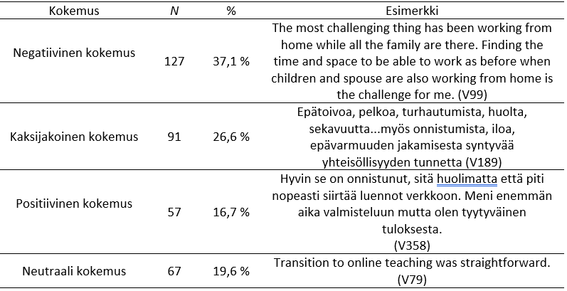 Vastausten perusteella 37,1 prosenttia (n = 127) korkeakouluopettajista koki negatiivisia, 26,6 prosenttia (n = 91) kaksijakoisia, 16,7 prosenttia positiivisia (n = 57) ja 19,6 prosenttia (n = 67) neutraaleja kokemuksia.
