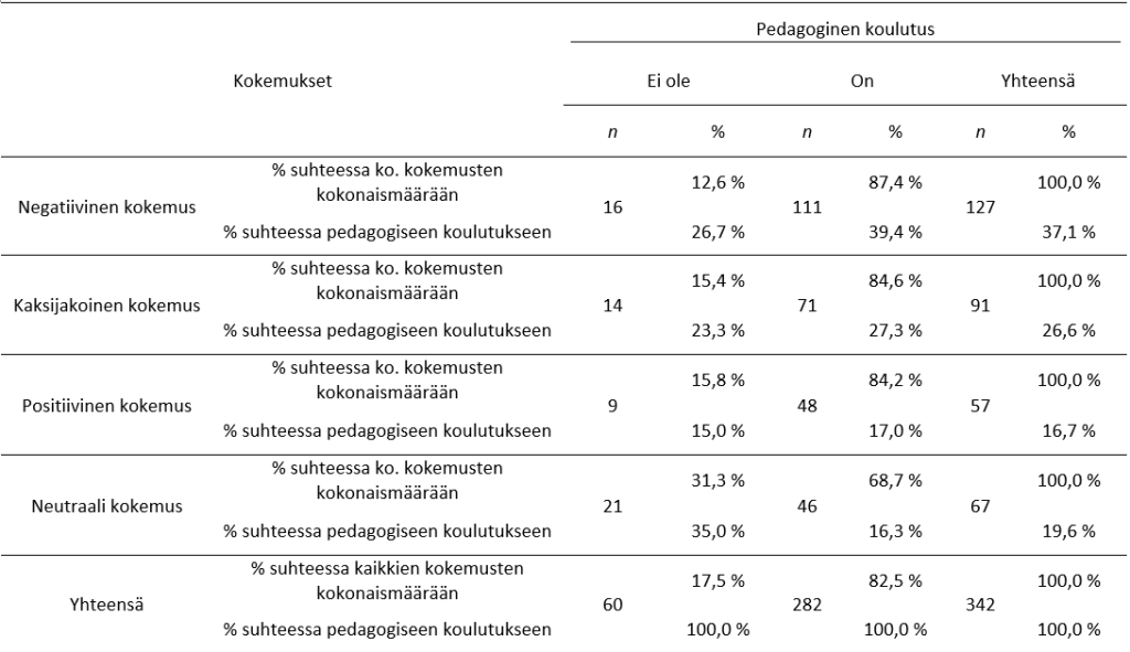 Niiden opettajien vastauksista, joilla ei ollut pedagogista koulutusta, 35,0 prosenttia (n = 21) luokiteltiin neutraaleiksi, kun pedagogisesti koulutetuilla vastaava prosenttiosuus oli 16,3 (n = 46). Pedagogisesti koulutetuista opettajista 39,4 prosenttia (n = 111) mainitsi negatiivisia seikkoja ja ei-koulutetuista 26,7 prosenttia (n = 16). Yhteys oli kohtalainen (Cramerin V = 0,182), eli pedagoginen koulutus selittää kohtalaisesti vastausten jakautumista. Toisin sanoen edellä mainittujen prosenttien perusteella pedagogisesti koulutetut mainitsivat useammin negatiivisia kokemuksia kuin kouluttamattomat, joiden kommentit olivat usein neutraaleja.