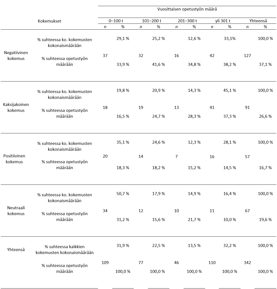 Vuosittaisella opetustyömäärällä oli tilastollisesti merkitsevä yhteys pandemian aikaisiin kokemuksiin (khiin neliö = 23,876, df = 9, p < 0,005), mutta kohtalainen vaikutus vastauksiin (Cramerin V = 0,153) (ks. Healey, 2010). Opetustyömäärä selittää kohtalaisesti vastausten jakautumista. Taulukossa 5 on esitelty opetustyömäärän ja kokemusten ristiintaulukointi. Neutraalisti vastanneista opettajista 50,7 prosentilla (n = 34) oli 0–100 tuntia opetusta vuodessa. Myös positiivisesti vastanneista opettajista 35,1 prosentilla (n = 20) oli 0–100 tuntia opetusta vuodessa. Kaksijakoiseen kategoriaan vastanneista 45,1 prosentilla (n = 41) ja negatiivisesti vastanneista 33,1 prosentilla (n = 42) oli yli 301 tuntia vuodessa opetusta, eli suuri opetustyömäärä oli yhteydessä kaksijakoisiin kokemuksiin pandemian aiheuttamista muutoksista.