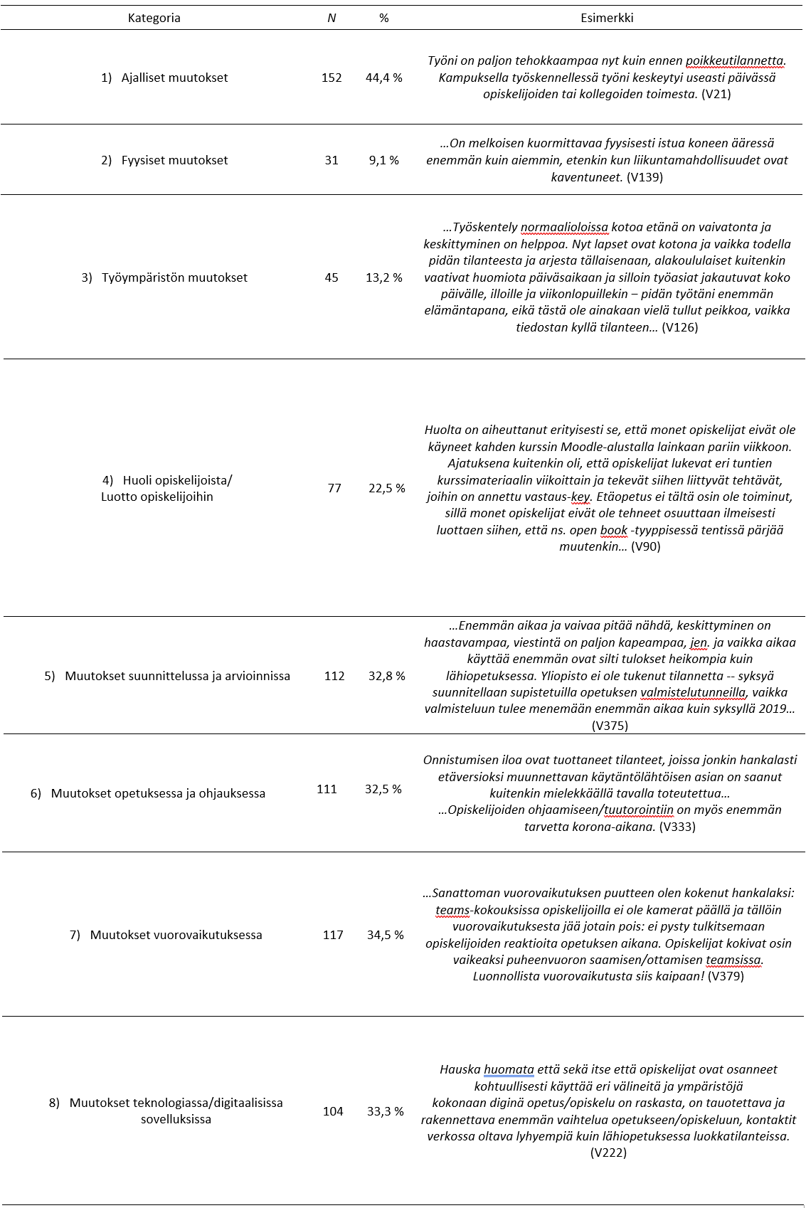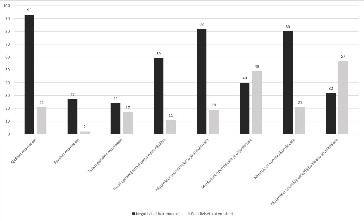 Korkeakouluopettajien vastauksista muodostettiin kahdeksan kategoriaa, jotka ilmensivät opettajien kokemuksia: 1) ajalliset muutokset, 2) fyysiset muutokset, 3) työympäristön muutokset, 4) huoli opiskelijoista ja luotto opiskelijoihin, 5) muutokset suunnittelussa ja arvioinnissa, 6) muutokset opetuksessa ja ohjauksessa, 7) muutokset vuorovaikutuksessa ja 8) muutokset teknologiassa ja digitaalisissa välineissä.