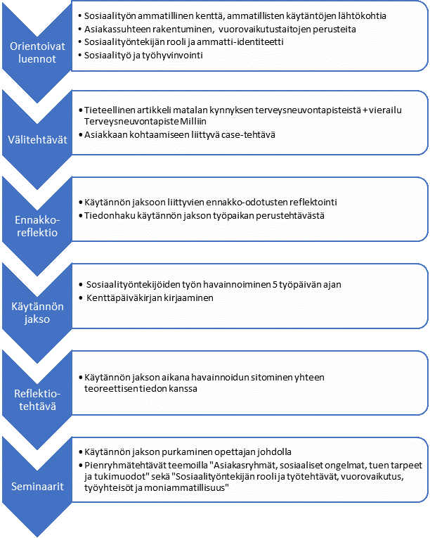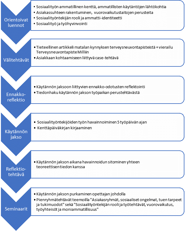 Opintojakso käynnistyi orientoivilla luennoilla (12 tuntia), joilla käsiteltiin sosiaalityön ammatillista kenttää, asiakassuhteen rakentumista, sosiaalityöntekijän roolia, ammatillisten käytäntöjen lähtökohtia ja niitä koskevia käsitteitä, vuorovaikutustaitojen perusteita, hyvän asiakassuhteen elementtejä, työhyvinvointia sosiaalityön kentällä sekä sosiaalityöntekijän ammatti-identiteettiä. Luento-opetusta täydensivät lyhyet kirjalliset välitehtävät, jotka liittyivät asiakaskokemukseen ja sen jäsentämiseen sekä asiakkaan kohtaamisen peruskysymyksiin. Näissä käytettiin oheismateriaaleina tutkimusartikkelia ja oheiskirjallisuutta. Toinen välitehtävistä nivoutui vapaaehtoisena tarjottuun kenttävierailuun (ks. kuvio 1), mikä tuki edelleen teorian ja käytännön sitomista toisiinsa.