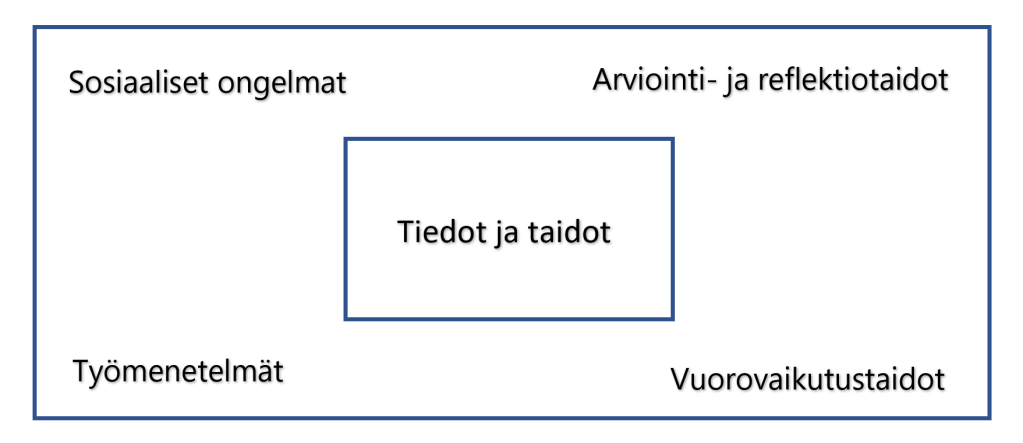 Miksi lähdimme vahvistamaan käytäntöyhteyttä juuri työelämään sijoittuvalla käytännön jaksolla? Selvitykset yliopistokoulutukseen sisällytetyistä käytännön jaksoista ovat osoittaneet, että opiskelijat mieltävät käytännön jaksot ainoiksi paikoiksi oppia työelämän kannalta oleellisia taitoja (mm. Penttilä & Virtanen, 2011) ja niin opiskelijat, opettajat kuin työnantajat pitävät työelämässä oppimista positiivisena asiana (mm. Mäkinen-Streng, 2010; Penttilä & Virtanen, 2011). Koimme kuitenkin merkitykselliseksi, että lyhyen käytännön jakson yhteyteen sidottiin myös muuta opetusta, jotta jakso ei jäisi irralliseksi opiskelijoiden tiedonmuodostamisprosessissa. Opintojakson tematiikan suunnittelussa meitä ohjasijäsennys sosiaalityöntekijän asiakastyössä tarvitsemista tiedoista ja taidoista (kuvio 2).