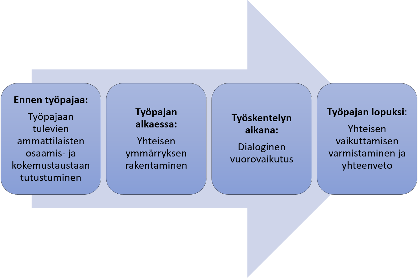 Ennen työpajojen toteuttamista hankkeen monialaiselle toimijaryhmälle järjestettiin dialoginen tutustumistilaisuus, jonka tarkoituksena oli jakaa toimijoiden asiantuntijuutta sekä luoda yhteistä kieltä ja toimintakulttuuria. Tässä tilaisuudessa päätettiin työpajojen toteuttamista tukevan tarkistuslistan laatimisesta ja siihen liittyvästä kehitystyöstä. Tarkistuslista auttaa huomion kiinnittämisessä monialaisen työskentelyn onnistumisen edellytyksiin suunnitteluvaiheesta työpajan aloitukseen, työskentelyvaiheeseen sekä päättämiseen (kuvio 1 ja liite 1).
