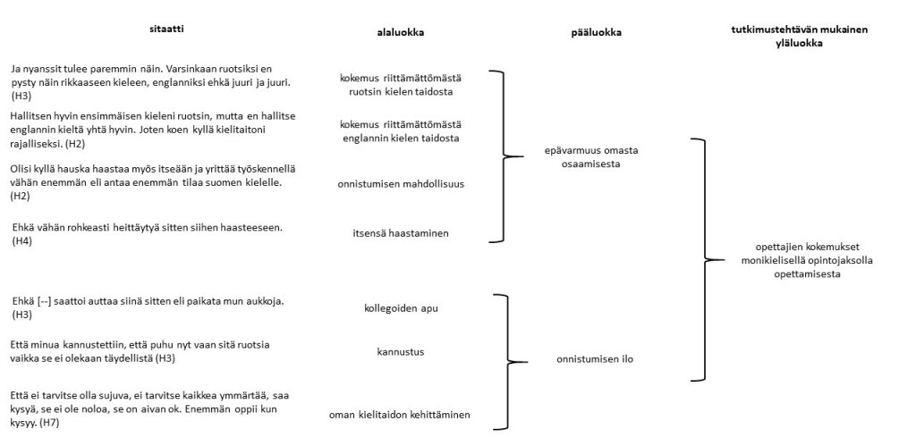Aineiston analyysissä käytimme NVivo12-aineistonhallintaohjelmaa. Muodostimme alaluokat haastattelun aihealueiden mukaisesti, esimerkiksi kokemus riittämättömästä ruotsin/englannin kielen taidosta. Täsmensimme luokkia analyysin edetessä ja yhdistimme niistä pääluokkia, esimerkiksi epävarmuus omasta osaamisesta. Lopuksi muodostimme tutkimuskysymykseen yhteydessä olevan yläluokan, esimerkiksi opettajien kokemukset monikielisellä opintojaksolla opettamisesta.