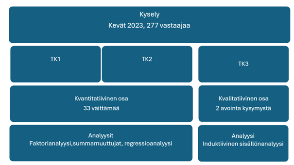 Tutkimuskysely pohjautui Heikkisen ym. (2020) tekemään selvitykseen opettajankoulutuksen vetovoimasta. Tähän artikkeliin valikoitiin mukaan osiot, jotka koskivat opettajankoulutuksen (8 väittämää) ja opettajan työn veto- ja pitovoimaisuutta (23 väittämää). Väittämiin vastattiin viisiportaisella Likert-asteikolla (”täysin eri mieltä”, ”eri mieltä”, ”ei eri eikä samaa mieltä”, ”samaa mieltä”, ”täysin samaa mieltä”). Opiskelijoiden haluttomuutta työskennellä opettajana kartoitettiin väittämällä ”en halua opettajan työhön”, johon myös vastattiin edellä mainitulla asteikolla. Tämän lisäksi opiskelijoiden ajatuksia opiskelupaikan vaihtamisesta kysyttiin esittämällä väittämä ”harkitsen opiskelupaikan vaihtamista”, johon vastattiin viisiportaisella Likert-asteikolla: ”en lainkaan”, ”joskus”, ”neutraali”, ”todennäköisesti”, ”erittäin varmasti”. Haluttomuutta työskennellä opettajana ja opiskelupaikan vaihdon harkitsemista koskevien väittämien jälkeen esitettiin vielä avokysymykset erinäisten syiden selvittämiseksi. Avokysymykset oli muotoiltu niin, että erityisesti niitä opiskelijoita, jotka eivät aikoneet opettajiksi tai harkitsivat opiskeluvaihdon harkitsemista, kannustettiin vastaamaan (esim. ”Jos vastasit samaa mieltä tai täysin samaa mieltä, kertoisitko miksi?”). Kaikilla osallistujilla oli kuitenkin mahdollisuus vastata avokysymyksiin.