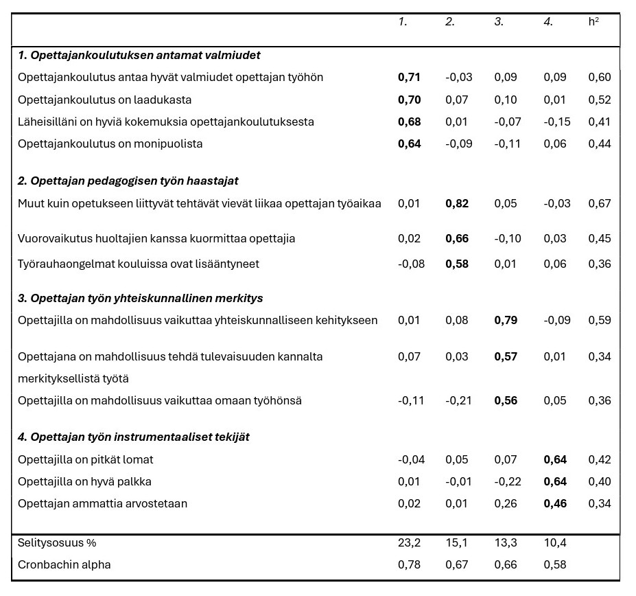 Ensimmäinen tutkimuskysymys kohdistui opettajaopiskelijoiden näkemyksiin opettajankoulutuksen ja opettajan työn houkuttelevuudesta. Tavoitteena oli etsiä aineistosta houkuttelevuutta kuvaavia tekijöitä eksploratiivisen faktorianalyysin keinoin. Analyysi tuotti neljän faktorin ratkaisun, joka oli sisällöllisesti linjakas, faktorit sisälsivät vähintään kolme väittämää, väittämien kommunaliteetit ja faktorilataukset olivat riittävän suuria ja ratkaisu ei sisältänyt merkittäviä ristiinlatauksia. Neljä opettajankoulutuksen ja opettajan työn houkuttelevuutta kuvaavaa faktoria nimettiin seuraavasti: 1) Opettajankoulutuksen antamat valmiudet, 2) Opettajan pedagogisen työn haastajat, 3) Opettajan työn yhteiskunnallinen merkitys sekä 4) Opettajan työn instrumentaaliset tekijät (taulukko 1).