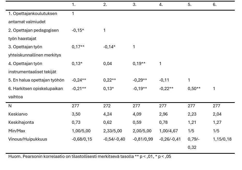 Muodostimme väittämistä faktoriratkaisun mukaiset keskiarvosummamuuttujat. Tämän jälkeen tarkastelimme summamuuttujien sekä opettajaopiskelijoiden haluttomuutta työskennellä opettajana ja opiskelupaikan vaihdon harkitsemista koskevien väittämien jakaumia ja korrelaatioita. Vinoutta ja huipukkuutta kuvaavien arvojen (taulukko 2) sekä jakaumien visuaalisen tarkastelun perusteella totesimme muuttujien jakaumat riittävän normaaleiksi parametrisiä testejä varten.
