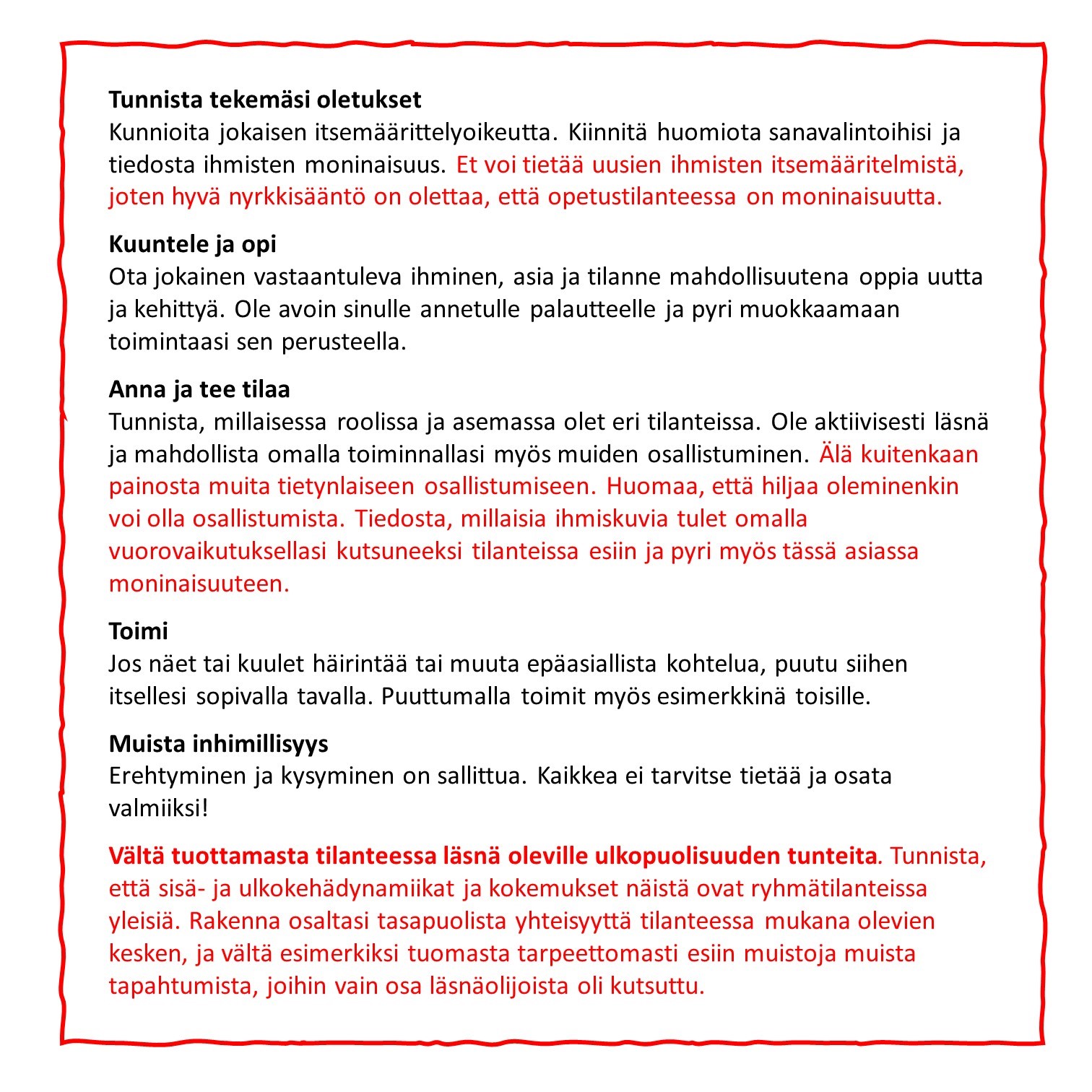 Suomalaisista yliopisto-opettajista suurin osa varmasti tietää, ettei sukupuolta tai esimerkiksi kansallisuutta, seksuaalisuutta, luokkaa tai vammaisuutta voi välttämättä lukea ulkomuodosta. Silti lipsahdukset ovat yleisiä. Samalla kun turvallisemman tilan periaatteet muistuttavat erehtymisen inhimillisyydestä ja siitä, että on parempi kysyä kuin ottaa asiat annettuina, ne kehottavat välttämään oletuksia. Näin siksi, että luokassa istuva ulkonäöltään erilainen opiskelija voi olla yhtä hyvin syntynyt ja kasvanut Suomessa kuin vieressä istuva valkoinenkin opiskelija. Turvallisemman tilan periaatteisiin tekemämme päivityksen avulla haluamme kuitenkin kiinnittää huomiota siihen, että myös luokkahuoneessa, jossa opiskelijat näyttävät silmämääräisesti hyvinkin samanlaisilta, voi olla läsnä paljon moninaisuutta.