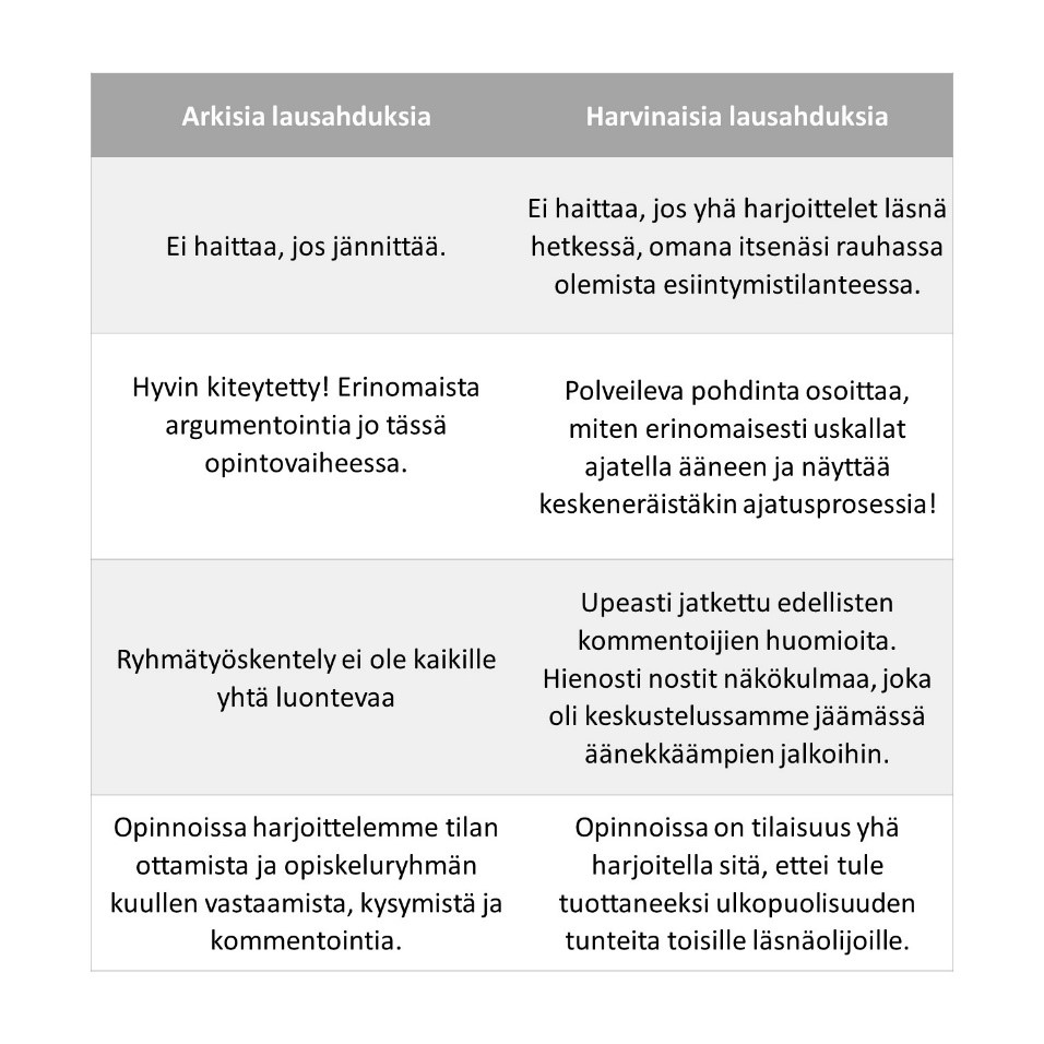 Yksiä oikeita vastauksia edellä mainittuun jännitteeseen ei ole, mutta ehdotamme, että turvallisemman tilan periaatteet yliopisto-opetuksessa ohjaisivat kaikkia osallistujia, erityisesti opettajia, tiedostamaan, millaisia ihmiskuvia he omalla arkisellakin vuorovaikutuksellaan tuottavat toivottaviksi, normalisoitaviksi tai vaietuiksi. Olemme listanneet taulukkoon 1 neljä esimerkinomaista lausahdusta, joita opetustilanteissa käytetään melko yleisesti. Jälkimmäiseen sarakkeeseen olemme muotoilleet neljä vastaavaa lausahdusta, joita tuskin opetustilanteissa juuri kuulee. Haluamme herättää keskustelua siitä, miksi ensimmäiset lausahdukset ovat niin tavallisia ja jälkimmäiset niin harvinaisia.