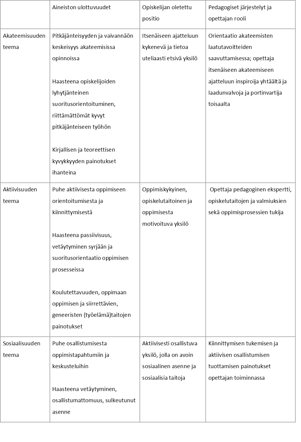 Haastatteluaineisto jäsentyi kolmeen laajempaan kokonaisuuteen. Näistä ensimmäisessä, akateemisuuden teemassa, oletetun opiskelijan ajatellaan olevan itsenäiseen ajatteluun kykenevä ja tietoa uteliaasti etsivä subjekti. Tässä teemassa opettajan rooli määrittyy ohjaajaksi, inspiroijaksi ja laadunvalvojaksi, jolloin pedagogiset järjestelyt muotoutuvat akateemisten laatutavoitteiden saavuttamisen näkökulmasta.
