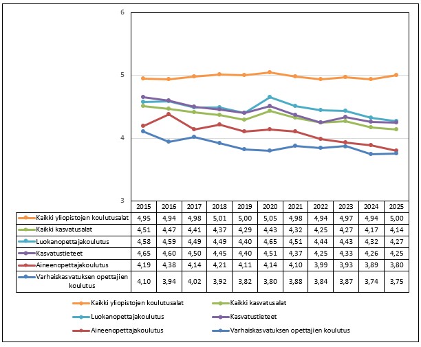 Yliopistojen kaikilla koulutusaloilla aloittavien opiskelijoiden ylioppilaskirjoitusten kaikkien aineiden keskiarvot ovat pysyneet keskimäärin samoina (noin 5,0), kun taas kaikkien kasvatusalojen keskiarvo on laskenut 4,5:stä 4,1:een vuosina 2015–2025 (ks. kuvio 1). Luokanopettajakoulutuksessa opiskelupaikan vastaanottaneiden ylioppilaskirjoitusten arvosanojen keskiarvo on keskimäärin paras kasvatusalalla vaihdellen eri vuosina 4,27–4,55 välillä. Varhaiskasvatuksen opettajien koulutuksessa ja aineenopettajakoulutuksessa opiskelupaikan vastaanottaneiden ylioppilaskirjoitusten arvosanojen keskiarvot ovat alhaisimpia niiden vaihteluvälin ollessa 3,75–4,38 vuosina 2015–2025.