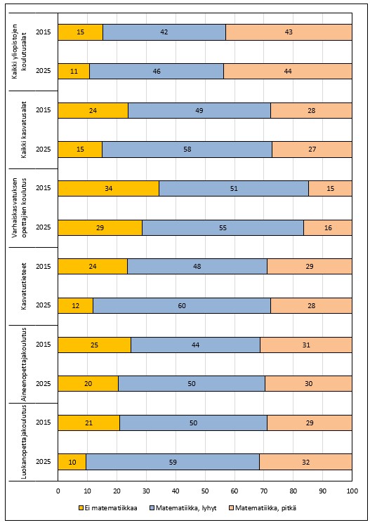Vuonna 2025 kaikista yliopistoissa opintonsa aloittaneista opiskelijoista 44 prosenttia oli kirjoittanut pitkän matematiikan, 46 prosenttia lyhyen matematiikan ja yksitoista prosenttia ei ollut kirjoittanut matematiikkaa ollenkaan (ks. kuvio 3). Samana vuonna kasvatusaloilla aloittavista opiskelijoista 27 prosenttia oli kirjoittanut pitkän matematiikan, 58 prosenttia lyhyen matematiikan ja 15 prosenttia ei ollut kirjoittanut lainkaan matematiikkaa. Kasvatusaloilla erityisesti lyhyen matematiikan kirjoittaminen yleistyi verrattaessa vuosia 2015 ja 2025. Erityisen paljon lyhyen matematiikan kirjoittaminen lisääntyi kasvatustieteen pääaineopiskelijoilla (erotus 12 prosenttiyksikköä). Pitkän matematiikan kirjoittaminen yleistyi eniten luokanopettajakoulutuksessa aloittavilla opiskelijoilla (erotus kolme prosenttiyksikköä).
