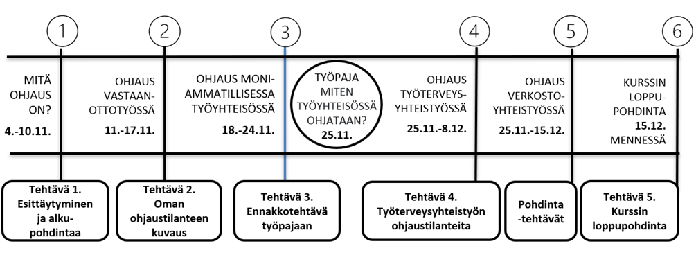 Koulutus rakentui kuudesta osiosta (kuvio 2). Ensimmäinen osio sisälsi osallistujien esittäytymisen ja alkupohdintaa ohjaamisesta omassa työssä. Toinen osio käsitteli yksilötason kohtaamisia vastaanottotyössä. Kolmannessa osiossa tunnistettiin hyvän ohjauksen elementtejä moniammatillisessa yhteistyössä. Aiheen käsittelyä jatkettiin vuorovaikutteisessa etätyöpajassa. Osiossa neljä tarkasteltiin työterveysyhteistyön ohjaustilanteita. Itsenäisesti suoritettavassa viidennessä osiossa ohjaustilanteita tarkasteltiin verkostoyhteistyössä. Lopputehtävänä oli oman näkemyksen reflektoiminen ohjauksesta. Osallistujia pyydettiin kuvaamaan, miten ohjaus näkyy omassa työterveyslääkärin työssä ja miten he soveltavat oppimaansa käytännössä, sekä kertomaan oman ohjausosaamisensa vahvuuksia ja kehittymiskohteita.